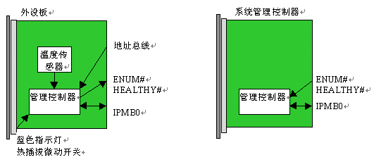 PICMG 2.9規(guī)范得到了進(jìn)一步的改善,增補(bǔ)了一份變更通知,解決了最初2.9規(guī)范中的一些缺陷。ECR致力于定義一種就軟件來說與硬件無關(guān)的機(jī)制,這種機(jī)制能判別背板的容量以及哪個(gè)槽位已經(jīng)插入了CompactPCI單板。位于一個(gè)標(biāo)準(zhǔn)CompactPCI單板上的管理控制器可能會和地址總線、位于單板把手上熱插拔微動(dòng)開關(guān)、藍(lán)色的熱插拔燈、甚至是HEALTHY和ENUM#信號聯(lián)通。典型的系統(tǒng)管理控制器板與位于外設(shè)板上的管理控制器的聯(lián)接如下圖3所示: