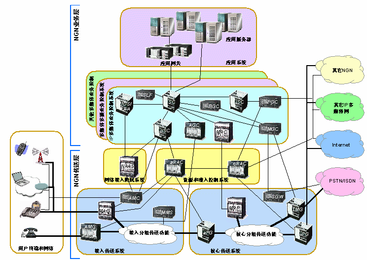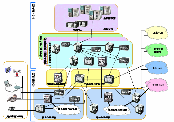NGN網(wǎng)絡(luò)邏輯上可分為用戶網(wǎng)、接入網(wǎng)和核心網(wǎng)。網(wǎng)絡(luò)的管理界限將NGN劃分為一些不同的NGN域。接入網(wǎng)和核心網(wǎng)可在同一NGN域中,也可以屬于不同的域。域內(nèi)的網(wǎng)絡(luò)拓?fù)湫畔⒖梢詫ν馄帘。域和域之間的互通將通過網(wǎng)關(guān)來完成。NGN支持與現(xiàn)有的網(wǎng)絡(luò)互通,如電話網(wǎng)絡(luò)、蜂窩網(wǎng)絡(luò)、互聯(lián)網(wǎng)等。NGN還支持各種有"NGN意識(shí)"的用戶設(shè)備和現(xiàn)有的無"NGN意識(shí)"的終端,如模擬電話機(jī)、傳真機(jī)、ISDN終端等。這些互通都通過網(wǎng)關(guān)來完成。NGN的網(wǎng)關(guān)主要包括多媒體接入網(wǎng)關(guān)、接入媒體網(wǎng)關(guān)、中繼媒體網(wǎng)關(guān)、分組網(wǎng)關(guān)和信令網(wǎng)關(guān)。