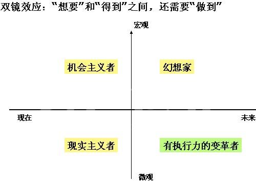 第二種左上角是“機(jī)會主義者”,既有宏觀的視角,又注重當(dāng)前的機(jī)會,然而遺憾的是往往這樣缺乏足夠的前瞻性,抓住了眼前的機(jī)會,卻錯失了未來的藍(lán)圖和方向。