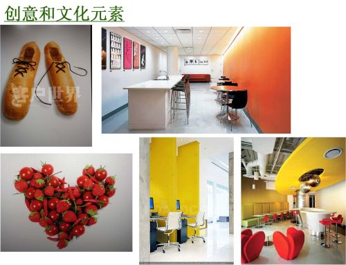 左下邊的這個(gè)圖是我自己非常喜歡的,就是在一個(gè)咖啡館里面,用一些番茄、一些小的辣椒和一些草莓搭成這樣一個(gè)形狀。上面大家看是鞋子,其實(shí)是兩塊面包把中間挖空了,鞋帶是巧克力,用這種方式來調(diào)動別人在咖啡館里面的食欲。我們在話房里面是一樣的,要讓客服代表,特別是那個(gè)年齡段20-25歲之間年輕的男孩子和女孩子們喜歡,甚至他們有一種重回學(xué)校的感覺都可以。所以這里面不用花太多的心思可以有很好的創(chuàng)意。在這個(gè)話房的設(shè)計(jì)當(dāng)中,覺得從環(huán)境的角度和自己能夠著手去改變的角度來看,已經(jīng)可以把你得話房做出自己的特色,就像我們在自己家里裝修一樣,可以有不同的色彩,也可以由不同的結(jié)構(gòu),當(dāng)然需要滿足公司給你預(yù)算的要求。
