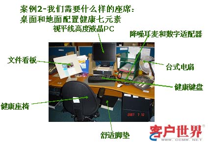 還有我想講的關(guān)于健康的配套設(shè)施和健康的辦公習(xí)慣,大家在呼叫中心里面可能大部分朋友,不一定真的每天都去體驗(yàn)客服代表的生活,但是我可以跟大家講,呼叫中心里面其實(shí)有相當(dāng)多的健康殺手,比如說你的環(huán)境,之前講的空氣質(zhì)量、燈光,還有我們工作的強(qiáng)度,電器、電腦的輻射,其實(shí)對客服代表的健康是有一定損害的,非常重要的提醒大家,如何讓客服代表感受到我是在非常健康和安全的環(huán)境下工作,這個(gè)非常重要。
