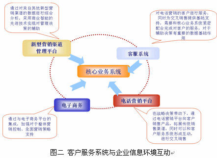 客戶服務(wù)系統(tǒng)不是孤立的系統(tǒng),是能夠與客戶現(xiàn)有信息環(huán)境,包括:核心業(yè)務(wù)系統(tǒng)、多渠道營銷、電子商務(wù)等進(jìn)行互動的智能信息系統(tǒng),從而使呼叫中心成為企業(yè)的戰(zhàn)略資產(chǎn),幫助企業(yè)提升客戶滿意度、深度挖掘客戶價值?蛻舴⻊(wù)系統(tǒng)與企業(yè)其它信息系統(tǒng)的互動可以通過圖二反映。