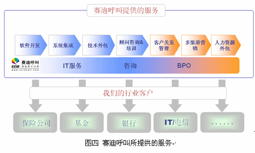 同時,賽迪呼叫所推薦給企業(yè)的并非只是軟件,而是結(jié)合了賽迪呼叫豐富的運(yùn)營服務(wù)經(jīng)驗、技術(shù)服務(wù)能力的全方位信息化服務(wù)。賽迪呼叫的這種全面的信息化服務(wù),涵蓋IT服務(wù)、咨詢服務(wù)、BPO等,圖四給出了相應(yīng)展示。