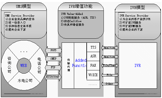 傳統(tǒng)UMS的分散的網(wǎng)民,而IVR, UMS服務(wù)提供商的客戶是企業(yè),系統(tǒng)的使用者則是企業(yè)的客戶(即系統(tǒng)面向下家,由下家為最終客戶提供服務(wù)),分離的模式可以有兩個(gè)獨(dú)立的企業(yè)來(lái)運(yùn)營(yíng)系統(tǒng),IVR Service由具有電信資源的企業(yè)(如:具有接入號(hào),有電信中繼資源,還有CTI系統(tǒng)建設(shè)經(jīng)驗(yàn))運(yùn)營(yíng)。UMS Service由ISP企業(yè),網(wǎng)站門戶企業(yè)等在互聯(lián)網(wǎng)絡(luò)有建設(shè)經(jīng)驗(yàn)的企業(yè)運(yùn)營(yíng)。兩家企業(yè)密切合作。共同提供完善的統(tǒng)一的信息服務(wù)。