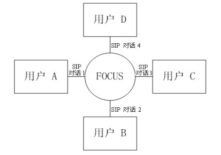緊耦合會議的邏輯架構(gòu)圖如圖三所示。會議中的核心是"會議中心(conference focus)",每一個會議都有一個會議中心,由一個URI標識,用戶通過聯(lián)系這個URI參加到一個會議中去。會議中心和用戶之間的拓撲結(jié)構(gòu)為星性結(jié)構(gòu)。會議中心為用戶提供并維持一個信令連接,并且可以執(zhí)行會議策略,實現(xiàn)對會議的控制和管理。