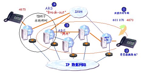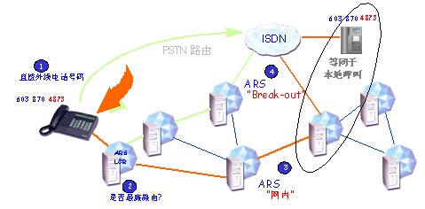 如果,一個(gè)網(wǎng)絡(luò)用戶想與一個(gè)外線用戶通話。ARS應(yīng)用程序分析所撥號(hào)碼。根據(jù)不同的呼叫方向,選擇最廉費(fèi)用的運(yùn)營(yíng)商,而不管網(wǎng)絡(luò)內(nèi)的物理連接。地址信息將會(huì)被修改,從而符合該運(yùn)營(yíng)商的編號(hào)計(jì)劃(增加,刪除或轉(zhuǎn)換數(shù)字),并且被叫號(hào)碼和轉(zhuǎn)換后的號(hào)碼將會(huì)被存貯在呼叫詳細(xì)記錄(CDR)內(nèi)。