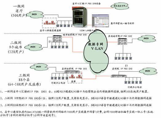 根據(jù)合同,阿爾卡特將提供1套Omni PCX Enterprise(面向大中型企業(yè)的通信平臺(tái))500用戶作為核心交換節(jié)點(diǎn),97套Omni PCX Office(面向中小型企業(yè)的通信平臺(tái))系統(tǒng)分別為60-160用戶作為分支交互節(jié)點(diǎn)。全網(wǎng)支持多達(dá)7000多個(gè)用戶,覆蓋貴州省檢察院、9個(gè)地市檢察院和88個(gè)區(qū)縣檢察院。在設(shè)計(jì)組網(wǎng)方案時(shí),阿爾卡特根據(jù)用戶的需求和實(shí)際情況,并充分考慮現(xiàn)有的數(shù)據(jù)網(wǎng)絡(luò)資源,提出采用點(diǎn)對多點(diǎn)的網(wǎng)絡(luò)結(jié)構(gòu)建設(shè)VOIP語音網(wǎng)絡(luò),不僅可以充分保障通信的安全性和可靠性,同時(shí)還可最大限度保護(hù)現(xiàn)有投資,節(jié)省費(fèi)用。