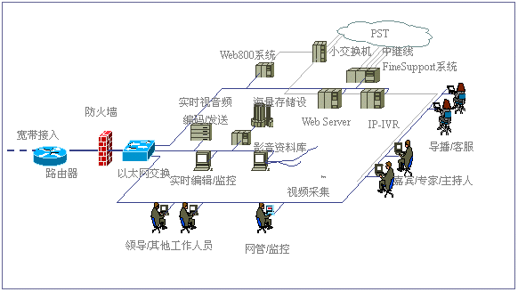 經(jīng)過對比分析,我們發(fā)現(xiàn),目前國際國內(nèi)市場上很多客戶服務產(chǎn)品,大都僅僅完成客戶服務的一部分。北極星“IP互動客戶服務中心解決方案”則引入互動客戶服務(ICS:Interactive Customer Service)系統(tǒng)以及數(shù)碼互動直播的概念,形成了由視頻點播、網(wǎng)上路演、語音和文字交互、IP客戶服務中心、Web800語音電話、實時服務中心、專家實時在線、客戶關(guān)系管理、在線尋呼系統(tǒng)和客戶社區(qū)服務系統(tǒng)等全方位的服務內(nèi)容。該方案主要基于IP架構(gòu),系統(tǒng)擴展性非常靈活,系統(tǒng)體現(xiàn)的客戶服務思想非常能夠滿足我們的需求。2001年3月,經(jīng)過一段時間的試運行后,我們正式推出了這套“IP互動客戶服務”系統(tǒng)。