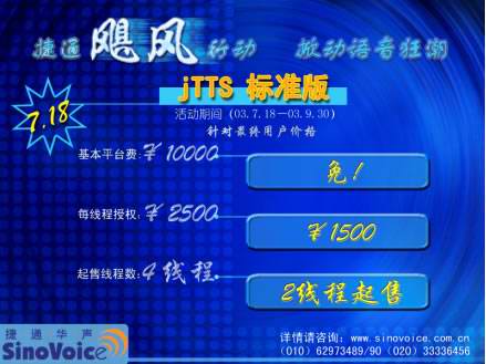 2003年7月18日,北京捷通華聲語音技術(shù)有限公司正式發(fā)布捷通華聲語音合成技術(shù) “jTTS標準版”。為慶!癹TTS標準版”的正式上市,為期近三個月,推廣“jTTS標準版”的捷通“颶風行動”也在同一時間正式啟動! 捷通“颶風行動”的宗旨--用全新的產(chǎn)品、全方位的服務(wù)、最具競爭力的價格與所有CTI領(lǐng)域的企業(yè)合作,開啟面向中小型CTI系統(tǒng)語音應(yīng)用的市場大門,為CTI產(chǎn)業(yè)發(fā)展提供持久動力支持!