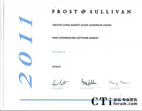 CTI論壇(ctiforum)1月12日消息(記者 浩宇):全球領(lǐng)先的Web會(huì)議解決方案供應(yīng)商V2威速宣布,榮獲全球領(lǐng)先咨詢公司Frost&Sullivan頒發(fā)的“大中華區(qū)Web軟件會(huì)議市場份額領(lǐng)導(dǎo)者”殊榮。Frost & Sullivan設(shè)立該獎(jiǎng)項(xiàng)旨在表彰各個(gè)行業(yè)領(lǐng)域在過去一年業(yè)績表現(xiàn)最佳并占有最高市場份額的企業(yè)。