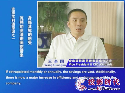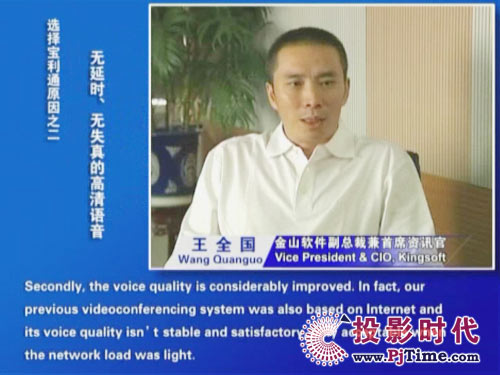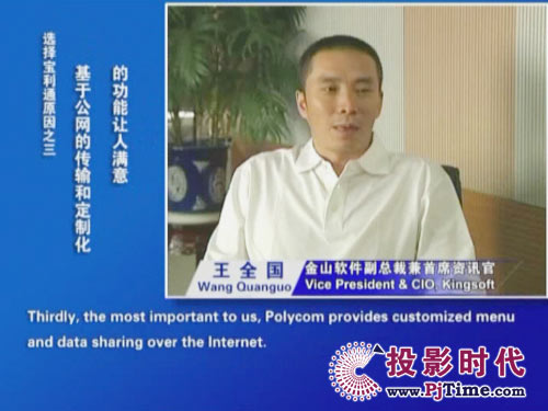 金山軟件副總裁兼首席資訊官王全國先生說道:“對于軟件行業(yè)來說,及時(shí)、高效的溝通是保持競爭優(yōu)勢的重要前提。相比之前使用的標(biāo)清產(chǎn)品,寶利通高清視頻會(huì)議系統(tǒng),提供了完全不同的體驗(yàn),流暢的高清晰畫面猶如真實(shí)的面對面溝通。而且我們公司并沒有申請專線,所有的應(yīng)用都是基于公網(wǎng)實(shí)現(xiàn)的。另一方面,新型全中文定制菜單的運(yùn)用,令我們使用起來非常方便,這更提高了我們使用視頻通信手段實(shí)現(xiàn)異地溝通的熱情!