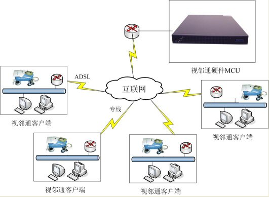 視鄰通系統(tǒng)采用軟硬結(jié)合的解決方案思想進行設計,主要組成是一個MCU,依據(jù)點數(shù)配備軟件終端,軟件終端含一個帶云臺可遠程遙控的攝像頭,以及一個自帶回音消除的全向麥與小音箱。和傳統(tǒng)323產(chǎn)品比較,部署簡單,靈活,在互聯(lián)網(wǎng)表現(xiàn)效果良好,并具備強大的數(shù)據(jù)功能,同時價格更具競爭力,而純軟視頻會議系統(tǒng)相比,則在穩(wěn)定性,清晰度上更勝一籌。