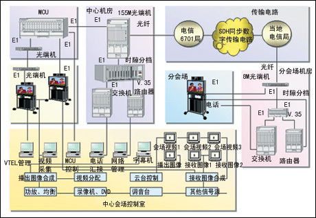 設(shè)備選用VTEL美國視訊公司銀河(Galaxy)755型視訊終端設(shè)備。該設(shè)備基于開放式的PC界面,操作簡單、升級容易,具有強大的多媒體和數(shù)據(jù)傳輸功能;具有先進的網(wǎng)絡(luò)管理功能;可靈活與局域網(wǎng)或與Internet相連接;設(shè)有多種連接端口;智能化程度較高。多點會議服務(wù)器MCU設(shè)備具有較強網(wǎng)絡(luò)適應(yīng)能力,可連續(xù)開機工作,運行穩(wěn)定。北京法院電視會議系統(tǒng)由1臺24點MCU設(shè)備和24臺VTEL銀河755型電視會議終端設(shè)備組成。