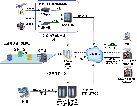中興通訊ZXV10 IPTV/VOD整體解決方案是專門針對電信運營商多媒體服務而設計的綜合解決方案。該系統(tǒng)可提供網絡電視(IPTV)、視頻點播(VOD)、準視頻點播(NVOD)、電子節(jié)目指南(EPG)等多種寬帶多媒體業(yè)務,系統(tǒng)全面支持xDSL和FTTx接入,支持MPEG2、MPEG4、WMV9等多種視音頻格式,在為運營商提供具有極高競爭力的、特色鮮明服務的同時,最大限度地提高運營商的收入。