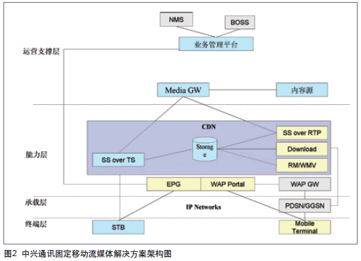 中興通訊的固定移動(dòng)流媒體解決方案,是在充分比較兩網(wǎng)的異同點(diǎn)之后,構(gòu)架的全新方案,其組網(wǎng)架構(gòu)如圖2所示!