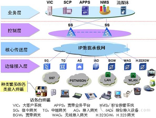 邊緣接入層:主要指與現(xiàn)有網(wǎng)絡(luò)相關(guān)的各種網(wǎng)關(guān)和新型接入終端設(shè)備,完成與現(xiàn)有各種類(lèi)型的通信網(wǎng)絡(luò)的互通并提供各類(lèi)通信終端(如模擬話(huà)機(jī)、SIP Phone、PC Phone、可視終端、智能終端等)到IP核心層的接入。