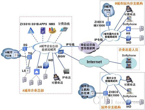 隨著大企業(yè)業(yè)務(wù)的不斷擴(kuò)大,在其他地區(qū)會(huì)建立一些分支機(jī)構(gòu)。針對(duì)這些需求,中興通訊推薦IP-PBX的多媒體組網(wǎng)方案,方案如下: