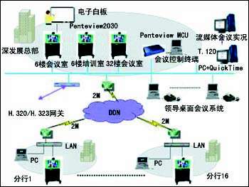中太數(shù)據(jù)為深圳發(fā)展銀行構建的視頻會議項目,是為深圳發(fā)展銀行在已有的DDN網(wǎng)絡的基礎上,構建的一個全國性的會議電視平臺。通過這個平臺,使跨地域的溝通更加經(jīng)濟、高效和靈活。針對深發(fā)展的網(wǎng)絡實際情況以及會議電視的發(fā)展方向,方案中采用基于MPEG-4的Penteview2030產(chǎn)品,支持H.323的MCU Penteview 6182,以及Penteview數(shù)據(jù)會議服務器。整個深發(fā)展會議電視系統(tǒng)組網(wǎng)分為兩級,中心點3套Penteview 2030到下面的16個異地的分支行。深圳發(fā)展銀行大廈6樓大會議室、培訓小會議室、32樓會議室作為主會議室,在6樓的機房中放置主MCU和一個終端,培訓小會議室放置一個終端,其他16個異地分支行分別放置一臺Penteview2030終端,通過現(xiàn)有的深發(fā)展DDN網(wǎng)絡相互連通。根據(jù)深發(fā)展通信網(wǎng)絡結(jié)構及傳輸容量的實際情況,該系統(tǒng)采用星型拓撲連接,各地可通過現(xiàn)有的DDN劃出768k-2M的帶寬,以視頻會議的方式組建起多點會議電視系統(tǒng)。各會場通過PC機實現(xiàn)數(shù)據(jù)會議功能。