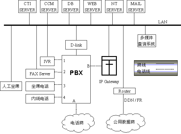 上圖所示的分布于不同地區(qū)的多個系統(tǒng)可以互相聯(lián)接,構(gòu)成分布式客戶服務(wù)中心,如地市話務(wù)員回答不了客戶的問題,可轉(zhuǎn)接到省中心,話務(wù)員在坐席上操作請求CCM轉(zhuǎn)接省中心,CCM通過CTI SERVER控制PBX將A與B接通,IP網(wǎng)關(guān)響應(yīng)呼叫,將電話號碼信號翻譯成相關(guān)的IP地址,將線路上的語音信號處理成數(shù)據(jù)信息并打包,通過本地LAN、本地ROTUER、公用數(shù)據(jù)網(wǎng)、省中心LAN等發(fā)送到省中心的IP網(wǎng)關(guān)、呼叫到達(dá)省中心PBX的B,按省中心系統(tǒng)的排隊和選擇坐席的規(guī)則選擇坐席,省中心的IP網(wǎng)關(guān)將接收到的數(shù)據(jù)解包還原成語音信號通過B送坐席電話3,雙方通話。這樣全省各市縣將聯(lián)結(jié)成一個大的分布式呼叫中心,同時IP電話也可用于企業(yè)內(nèi)部通信,通信費(fèi)將降至原來的一半以下。