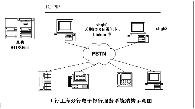 該系統(tǒng)以IBM提供的 R63和R44主機(jī)為中心,一臺(tái)Unix通信前置機(jī)通過CGS15通信卡與主機(jī)相連。該前置機(jī)與另一臺(tái)前置機(jī)連成局域網(wǎng),對(duì)外提供74線語音、傳真和MODEM服務(wù)。今后隨著業(yè)務(wù)的增長,可以通過增加通信前置機(jī)方式,增加對(duì)外服務(wù)線路,從而使系統(tǒng)具有良好的開放性和擴(kuò)展能力。
