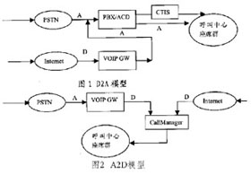 A2D法(Analog to Data) A2D法即事先將呼入呼叫中心的DTMF電話通過VoIP網(wǎng)關(guān)轉(zhuǎn)化為IP電話,再和來自Internet的IP電話一同接入座席代表。A2D法實(shí)現(xiàn)相對(duì)比較麻煩,但其將絕大部分工作放到計(jì)算機(jī)網(wǎng)絡(luò)這個(gè)開放的軟件平臺(tái)來做,除了有利于更新和開發(fā)外,還能降低成本。同時(shí),這種結(jié)構(gòu)能在地理上和物理上伸縮自如,不僅便于高度集成,而且便于跨地區(qū)構(gòu)建。