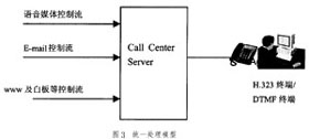 目前,IP Call Center實(shí)現(xiàn)綜合媒體統(tǒng)一處理的方式已取得比較一致觀點(diǎn),即如圖3的語音媒體流和IP傳真、Web主頁、Email進(jìn)入座席群前先經(jīng)過一個(gè)服務(wù)軟件進(jìn)行統(tǒng)一處理,該服務(wù)軟件一般廠家都稱為Call Center Server(簡(jiǎn)稱CCS服務(wù)器),它起著完成呼叫控制、路由處理、與呼叫同步的用戶數(shù)據(jù)管理及信息監(jiān)視等作用。