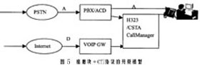 比較有代表性的解決方案有兩種,一種是效仿圖1的做法,在ACD的用戶側(cè)加入VoIP網(wǎng)關(guān),再統(tǒng)一接入(如圖4所示);另一種方法是采用價(jià)格比較便宜的IP座席卡,并在Call Manager中加入CTI的有關(guān)協(xié)議模塊(如圖5所示)。