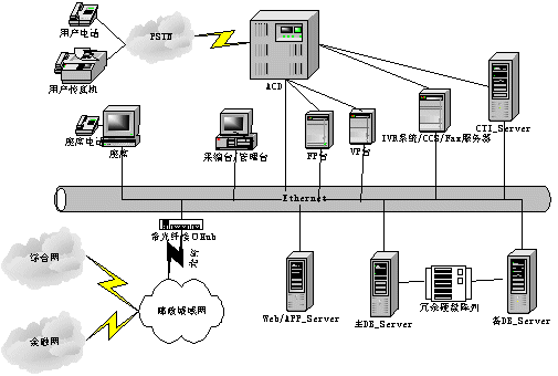 呼叫中心的功能主要有兩方面,一是與用戶進行交互,另外與金融主機房進行數(shù)據(jù)交互。呼叫中心系統(tǒng)由兩部分組成:聲訊平臺(CALL CENTER)和業(yè)務(wù)數(shù)據(jù)計算機網(wǎng)絡(luò)平臺。聲訊平臺由話務(wù)接入設(shè)備(ACD)、IVR系統(tǒng)和CTI服務(wù)器組成,主要負(fù)責(zé)語音資源的管理、呼入話務(wù)的排隊、自動業(yè)務(wù)以及人工座席的管理等;業(yè)務(wù)數(shù)據(jù)計算機網(wǎng)絡(luò)平臺是對業(yè)務(wù)數(shù)據(jù)的收集、使用、管理、分析等。平臺間通過CTI技術(shù)實現(xiàn)數(shù)字?jǐn)?shù)據(jù)和語音數(shù)據(jù)的相互轉(zhuǎn)換和同步轉(zhuǎn)移。系統(tǒng)結(jié)構(gòu)如下。