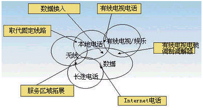 數(shù)據(jù)服務同本地電話服務的融合,是不來最重要的融合趨勢之一,其主要體現(xiàn)在通過本地電話可以解決數(shù)據(jù)業(yè)務的接入問題,可以提供窄帶或?qū)拵У慕尤肽芰ΑM瑫r,可以為Internet服務,如電子郵件服務同電話話音服務結(jié)合起來創(chuàng)造條件。一種未來的發(fā)展方向就是利用電話來接收電子郵件同時可以用電子郵件的方式閱讀語言信箱中的留言。“聽電子郵件,看語言信箱”是對這種融合服務的最好描述。而數(shù)據(jù)業(yè)務同長途電話業(yè)務的融合集中于通過VoIP技術(shù)提供長途電話服務,競爭收入最大的電信市場。數(shù)據(jù)服務同有線電視娛樂服務的融合主要體現(xiàn)在以Cable Modem做為數(shù)據(jù)接入手段和視頻點播這樣的娛樂服務。通過Cable Modem,有線電視網(wǎng)也可以提供本地電話和長途電話接入業(yè)務,象AT&T和TCI 及MediaOne 正在進行的電話業(yè)務實驗。而寬帶的數(shù)據(jù)接入則為數(shù)據(jù)服務的寬帶化提供了條件。