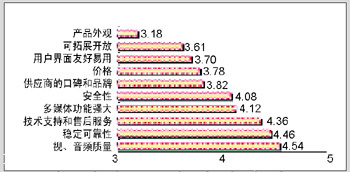 用戶認(rèn)為重要性一般但偏向重要3.5≤Y<4的指標(biāo)有供應(yīng)商的口碑、價格、用戶界面友好易用、可拓展升級四項。十項指標(biāo)中消費(fèi)者最低的也是評價重要性一般3≤Y<3.5的指標(biāo)是產(chǎn)品外觀。視頻會議終端系統(tǒng)界面的友好易用、供應(yīng)商的口碑等相對視音頻質(zhì)量、穩(wěn)定可靠性、安全性等指標(biāo)而言,重要性稍弱,這反映用戶對系統(tǒng)的要求趨于實際應(yīng)用的高效。而價格指標(biāo)重要性僅排在十項指標(biāo)測評的第七位,反映用戶對于視頻會議系統(tǒng)產(chǎn)品的價格敏感度不高,用戶在選購產(chǎn)品時,首先看重的是產(chǎn)品功能質(zhì)量性能。出于這一消費(fèi)傾向,用戶對于產(chǎn)品外觀重要性評價也自然偏低。