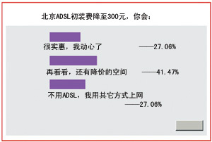 根據(jù)eNet資訊中心發(fā)起的“對(duì)北京ADSL初裝費(fèi)下調(diào)持何種看法”的網(wǎng)絡(luò)調(diào)查顯示,有近三成網(wǎng)民對(duì)北京通信ADSL初裝費(fèi)下調(diào)表示了歡迎。其中,占總數(shù)27.06%的網(wǎng)民表示該價(jià)格非常實(shí)惠,已經(jīng)有了安裝的想法;41.47%的網(wǎng)民持旁觀的態(tài)度,認(rèn)為價(jià)格還將進(jìn)一步下降。
