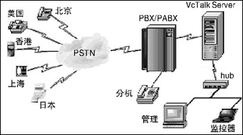 用語音板卡搭建電話會議一般注重在單一的音頻通信。考慮到單純的音頻或視頻會議模式都或多或少有各自的局限性,宇音將數(shù)據(jù)與語音整合在一起,實現(xiàn)音頻/圖文會議。VCTalk各系列電話會議系統(tǒng)采用高性能的語音/會議資源卡作為硬件支持,可實現(xiàn)多方電話會議(≥8),具有多組會議、與會者身份認證、設(shè)置會議主持人、邀請與會者、會議通知、會議內(nèi)容同步播放、會議密碼保護、智能播放、會議內(nèi)容全程錄音/存儲、本地/遠程查聽會議錄音的功能,并可以對企業(yè)內(nèi)部發(fā)生的呼叫記錄進行計費和統(tǒng)計。針對中小企業(yè)辦公靈活的特點,VCTalk系統(tǒng)搭建簡單易行,其結(jié)構(gòu)圖見圖1。