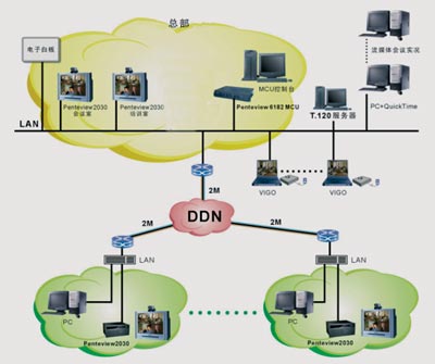 在上述網(wǎng)絡結(jié)構(gòu)中,還可以方便地繼續(xù)發(fā)展第三級視頻會議子網(wǎng)。正如前面提到的,這個第三級子網(wǎng)中,完全可以使用普通視頻會議終端,以節(jié)約大量費用。