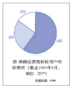 彩鈴業(yè)務(wù)最先是由韓國(guó)的SK電信于2002年3月推出的,業(yè)務(wù)一經(jīng)面世就吸引了移動(dòng)用戶、特別是年青用戶群體的眼球,開通的用戶數(shù)和業(yè)務(wù)使用率呈指數(shù)式增長(zhǎng);同時(shí)由彩鈴業(yè)務(wù)帶來的互聯(lián)網(wǎng)、WAP和IVR的話務(wù)量的增長(zhǎng)進(jìn)一步提升了彩鈴業(yè)務(wù)的含金量。隨后韓國(guó)的其他兩個(gè)移動(dòng)運(yùn)營(yíng)商LG電信和韓國(guó)電信也分別于2002年6月和9月相繼開通彩鈴業(yè)務(wù)。經(jīng)過運(yùn)營(yíng)商和彩鈴的內(nèi)容提供商的前期市場(chǎng)推廣和運(yùn)作,目前已發(fā)展了近1000萬用戶,其中運(yùn)營(yíng)商的市場(chǎng)份額如圖所示。