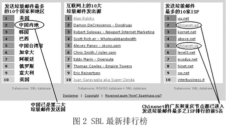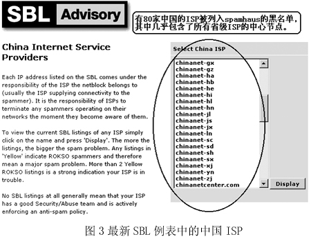 圖2是國(guó)際上著名的反垃圾郵件組織Spamhaus在網(wǎng)站上列出的統(tǒng)計(jì)排行榜,“China”已經(jīng)穩(wěn)居第二大垃圾郵件發(fā)送國(guó)的位置,而右邊的一個(gè)排行榜則從另一個(gè)角度向我國(guó)敲響了警鐘——在專(zhuān)為發(fā)送垃圾郵件的ISP所列的黑名單SBL中,我國(guó)Chinanet的兩個(gè)省級(jí)ISP在前10名中分列第2和第5名。而Chinanet作為中國(guó)的公用信息互聯(lián)網(wǎng)絡(luò),是我國(guó)的Internet骨干網(wǎng),是國(guó)內(nèi)用戶接入互聯(lián)網(wǎng)的主要途徑之一。“我們真不希望以這樣的方式‘揚(yáng)名海外’”,來(lái)自一家ISP的一位不肯透露姓名的女士說(shuō),“其實(shí)我們也是受害者!”