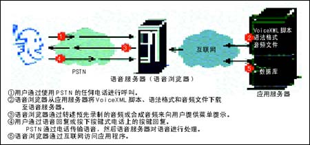 由于電話(包括很多蜂窩電話)沒有計(jì)算功能,無(wú)法管理語(yǔ)音瀏覽器,所以語(yǔ)音瀏覽器駐留在網(wǎng)絡(luò)上的語(yǔ)音服務(wù)器中。語(yǔ)音服務(wù)器可以位于企業(yè)數(shù)據(jù)中心,或者位于主管供應(yīng)商處。用戶撥叫一臺(tái)語(yǔ)音服務(wù)器,該服務(wù)器從一臺(tái)應(yīng)用服務(wù)器上下載VoiceXML 2.0腳本、語(yǔ)法格式和聲音文件。語(yǔ)音瀏覽器以一種語(yǔ)音信息的形式將VoiceXML 2.0腳本翻譯給用戶聽,語(yǔ)音信息可以是預(yù)先錄制的語(yǔ)音,或經(jīng)由一個(gè)文本語(yǔ)音合成器產(chǎn)生的文本。然后語(yǔ)音瀏覽器調(diào)用一個(gè)自動(dòng)語(yǔ)音識(shí)別(ASR)軟件,使用語(yǔ)法格式來識(shí)別出用戶響應(yīng)的語(yǔ)音詞匯。