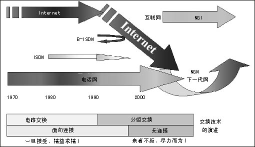 傳統(tǒng)電信網(wǎng)和互聯(lián)網(wǎng)都面臨著挑戰(zhàn),基于電話業(yè)務(wù)設(shè)計(jì)的電路交換網(wǎng)不能靈活適應(yīng)帶寬各異的數(shù)據(jù)業(yè)務(wù)的發(fā)展。專為數(shù)據(jù)業(yè)務(wù)設(shè)計(jì)的互聯(lián)網(wǎng)則存在著安全性、可管理性、商業(yè)模式等問題的困擾。NGI對目前電信網(wǎng)的主要盈利業(yè)務(wù)語音的質(zhì)量保證以及對電信網(wǎng)增長空間很大的業(yè)務(wù)(移動(dòng))關(guān)注不夠。NGI可能達(dá)到的目標(biāo)不能滿足電信界的需要。因此,在NGI之后ITU和ETSI等提出了更高的目標(biāo)——NGN,這就是NGN的提出背景。信息產(chǎn)業(yè)部電信研究院科技委副主任委員雷震洲認(rèn)為,兩大亮點(diǎn)點(diǎn)燃了NGN:一是數(shù)據(jù)超過語音的信息需求,全球互聯(lián)網(wǎng)用戶目前已逾7億,全世界在網(wǎng)上傳送的以IP為代表的數(shù)據(jù)業(yè)務(wù)量已經(jīng)超過語音業(yè)務(wù)量;二是移動(dòng)超過固定的個(gè)性化需求,全球移動(dòng)用戶已經(jīng)超過13億,近100個(gè)國家的移動(dòng)用戶數(shù)已經(jīng)超過固定用戶數(shù),我國在2003年10月移動(dòng)用戶也超過了固定用戶數(shù)。