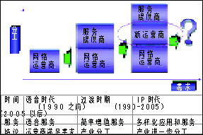 Switch(軟交換)、3G、IPv6等技術(shù)進(jìn)行系統(tǒng)構(gòu)筑,全面融合先進(jìn)的語音、數(shù)據(jù)及移動通信IP一體化解決方案,從而為企業(yè)提供不同需求層次的選擇。另外,由此導(dǎo)致產(chǎn)業(yè)結(jié)構(gòu)也悄悄地發(fā)生變化,產(chǎn)業(yè)朝三層級和多層級演變通信的新結(jié)構(gòu)和新角色:服務(wù)運營商的誕生,網(wǎng)絡(luò)運營商向服務(wù)提供商的轉(zhuǎn)型。