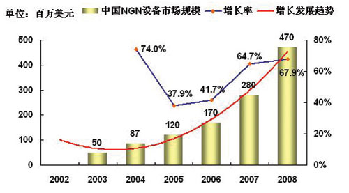 對于中國NGN市場規(guī)模的預測,主要取決于各個運營商在NGN方面的戰(zhàn)略發(fā)展重點,以及重點的投資方向。總體上來說,從2003年起,以IPTV、VOIP、寬帶接入等業(yè)務為代表的NGN的部分業(yè)務的推廣,使得事實上中國已經(jīng)形成一定的NGN的市場規(guī)模,盡管這一市場規(guī)模仍然很小。2004年中國的NGN基礎設備的市場規(guī)模超過8千萬美元,以后隨著各個運營商NGN戰(zhàn)略的進一步清晰,這一部分的投資會保持持續(xù)穩(wěn)定的增長,2005~2008年以后的NGN設備投資規(guī)模的平均增長率可以達到50%。