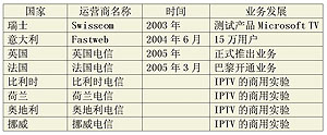 意大利FastWeb公司在歐洲IPTV發(fā)展中扮演了重要角色。其在IPTV經(jīng)營上的成功,改變了許多運(yùn)營商原先對(duì)IPTV的觀望態(tài)度。目前,除意大利外,英國、法國、瑞典、德國、摩納哥、挪威、比利時(shí)、荷蘭、奧地利等國也開通了IPTV業(yè)務(wù),其IPTV運(yùn)營商及業(yè)務(wù)推出時(shí)間詳見表5。