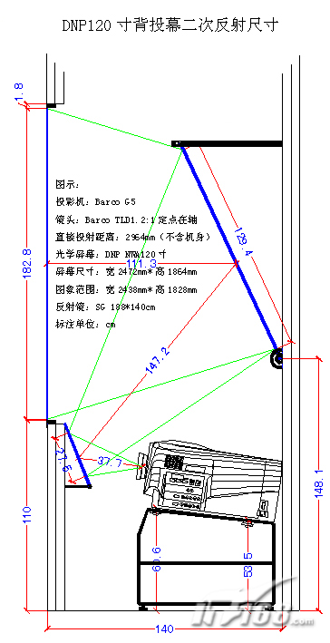 為了達(dá)到足夠大的尺寸,主屏幕采用SEAPRINE圖像控制器組成的1*2拼接,也就是采用了兩臺(tái)BARCO G5投影機(jī)來確保畫面的一流效果。不過由于投影距離的限制,這個(gè)方案里采用了二次反射系統(tǒng)。這也是這套方案的一個(gè)要點(diǎn)和關(guān)鍵。因?yàn)楹芏喙こ處熇靡恍└怕蕘砉浪阋淮位蚨啻握凵淇梢钥s短的投影距離,但欠缺科學(xué)和嚴(yán)謹(jǐn)?shù)膽B(tài)度,因?yàn)檫@個(gè)數(shù)據(jù)與屏幕安裝高度、投影方式(離軸或偏軸)、投影機(jī)體積、反射鏡面積等息息相關(guān)。