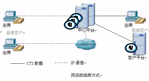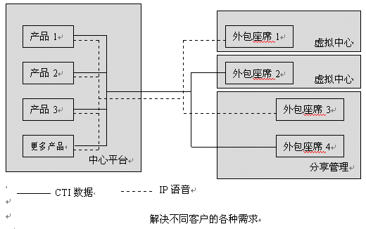 外包中心應(yīng)既能服務(wù)本地業(yè)務(wù),同時服務(wù)本區(qū)甚至全球業(yè)務(wù),單點互連接主要為降低服務(wù)成本,共享服務(wù)資源。單點中心應(yīng)具備靈活的組網(wǎng)方式,可管理客戶現(xiàn)有平臺,并具備高質(zhì)量座席向客戶提供高質(zhì)量的高端服務(wù),同時又有解決普通客戶服務(wù)的一般座席,向客戶提供低價位的公眾服務(wù),如下圖示意: