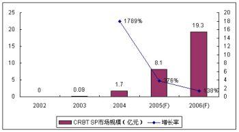 在運(yùn)營(yíng)商的大力推動(dòng)和SP/CP的積極努力下,無線音樂市場(chǎng)從2004年起進(jìn)入了井噴時(shí)期。CRBT業(yè)務(wù)具有的病毒式營(yíng)銷特性使得CRBT業(yè)務(wù)的滲透率增長(zhǎng)迅速,但其時(shí)尚特性又使得業(yè)務(wù)的滲透率高峰很容易達(dá)到、業(yè)務(wù)縱深有限。2005年,CRBT的SP市場(chǎng)規(guī)模增長(zhǎng)率為376%,較上一年的高速增長(zhǎng)有所回落。諾盛預(yù)計(jì)2006年運(yùn)營(yíng)商和SP/CP仍然會(huì)力推CRBT業(yè)務(wù)。在產(chǎn)業(yè)鏈積極推動(dòng)和用戶滲透率高峰已經(jīng)逼近的雙重制約下,諾盛預(yù)計(jì)CRBT業(yè)務(wù)的SP市場(chǎng)規(guī)模增長(zhǎng)率為138%,整體SP市場(chǎng)規(guī)模達(dá)到19.3億元。