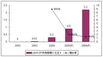 作為SP和移動(dòng)運(yùn)營(yíng)商都非?春玫臉I(yè)務(wù),JAVA業(yè)務(wù)受到眾多SP的青睞。盡管作為JAVA主要業(yè)務(wù)的手機(jī)游戲目前盈利狀況普遍欠佳,但空中網(wǎng)、美通無線、數(shù)字魚等SP仍然大量投入,期待著未來業(yè)務(wù)的高速增長(zhǎng)。受制于終端和JAVA游戲的表現(xiàn)力,2005年JAVA業(yè)務(wù)的SP市場(chǎng)規(guī)模增長(zhǎng)率回落到200%,諾盛預(yù)計(jì)2006年JAVA的使用環(huán)境沒有太大變化,其增長(zhǎng)率進(jìn)一步回落至144%。
