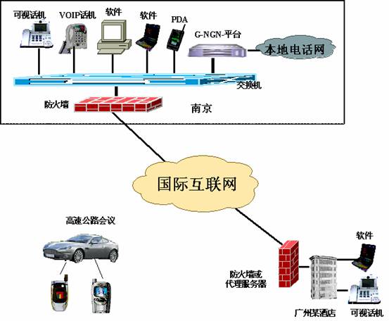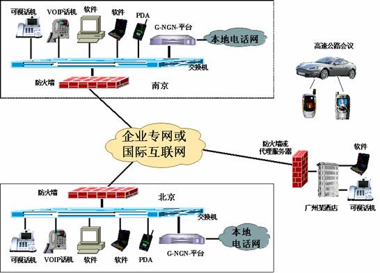 G-NGN-Softswitch產(chǎn)品可以使集團(tuán)用戶通過租用網(wǎng)絡(luò)運(yùn)營(yíng)商的寬帶線路,或者直接借助國(guó)際互聯(lián)網(wǎng)組建成連接全市、全省乃至全國(guó)的集團(tuán)內(nèi)部網(wǎng)絡(luò)電話,可以提供可視話機(jī)、非可視話機(jī)、客戶端軟件、PDA等多種便捷方式實(shí)現(xiàn)集團(tuán)內(nèi)部的可視或非可視通訊。