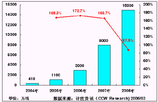 主流運(yùn)營(yíng)商N(yùn)GN網(wǎng)絡(luò)的規(guī)模化建設(shè),為IP Centrex、寬帶電話等新業(yè)務(wù)在國(guó)內(nèi)的大規(guī)模應(yīng)用提供了良好的支撐。計(jì)世資訊(CCW Research)預(yù)計(jì),在未來(lái)3年內(nèi),中國(guó)的NGN網(wǎng)絡(luò)建設(shè)規(guī)模將獲得快速增長(zhǎng),到2008年,將有望達(dá)到1.5億線的規(guī)模。