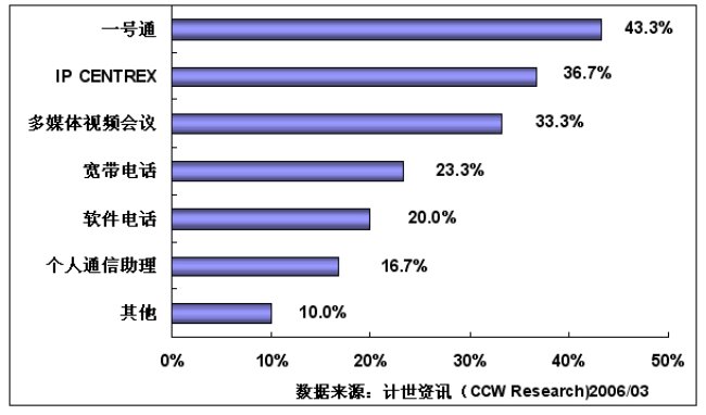 通過計世資訊(CCW Research)的調(diào)研可以看到,行業(yè)用戶對一號通、IP-CENTREX、多媒體視頻會議和寬帶電話等基于NGN平臺開發(fā)的業(yè)務(wù)比較感興趣,其中:對一號通感興趣的用戶達到43.3%,對IP-CENTREX感興趣的用戶為36.7%,對多媒體視頻會議感興趣的用戶達到33.3%,對寬帶電話感興趣的用戶達到23.3%,對軟件電話感興趣的用戶達到20.0%,對個人通信助理感興趣的用戶達到16.7%。