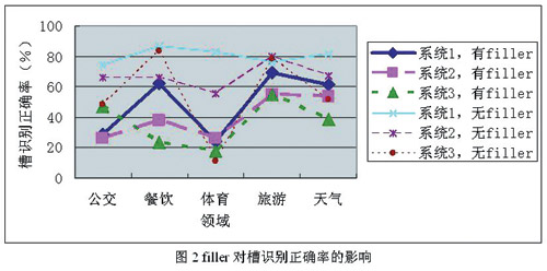 對于電話連續(xù)語音識別來說,由于錄制環(huán)境是辦公室真實環(huán)境,因此噪音并不是影響性能的主要因素。電話連續(xù)語音識別分為5個子領(lǐng)域,每個子領(lǐng)域各有一套語法。評測句子由語法生成的有效成分在前后加上任意長的填充詞(filler)構(gòu)成,如語法生成的句子為“從天安門到中關(guān)村怎么坐公交車”,而實際錄制的句子是“你好,請問從天安門到中關(guān)村怎么坐公交車,可以查到嗎?”,其中的“你好,請問”和“可以查到嗎”就是filler。由分析可以發(fā)現(xiàn),不同領(lǐng)域內(nèi)的槽識別正確率相差很大。這主要有兩個原因,一是不同領(lǐng)域的語法復雜度不同,二是不同領(lǐng)域內(nèi)有filler的句子所占比例不同。為了進一步衡量filler對識別的影響,選取三個識別系統(tǒng),將有filler的句子和沒有filler的句子分別計算識別率,統(tǒng)計結(jié)果如圖2所示。從圖中可以看出,filler對識別的影響是相當大的,無filler的句子比有filler的句子識別正確率可以高幾十個百分點。