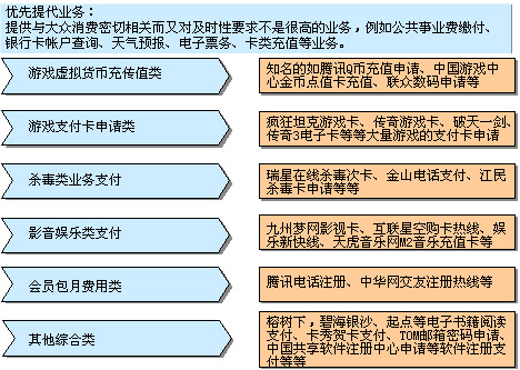 有了好的平臺與技術(shù),還必須設(shè)計好的業(yè)務(wù)。電信經(jīng)濟是一個從來就不缺少技術(shù)的經(jīng)濟,關(guān)鍵如何設(shè)計出一個符合用戶體驗、滿足用戶需求、方便用戶使用的業(yè)務(wù)?諾盛基于對于電信標(biāo)準(zhǔn)運營流程的研究結(jié)合國外的先進經(jīng)驗認(rèn)為:固話支付的業(yè)務(wù)大致可以分為兩類:一類是優(yōu)先發(fā)展的業(yè)務(wù);一類就是現(xiàn)金流業(yè)務(wù)