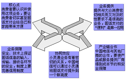 通過對整個支付體系的研究宋永軍認(rèn)為:對于固定電話支付來說存在著幾個關(guān)鍵因素,這些關(guān)鍵因素決定了這項業(yè)務(wù)能不能順利運轉(zhuǎn),發(fā)揮最大的效益。